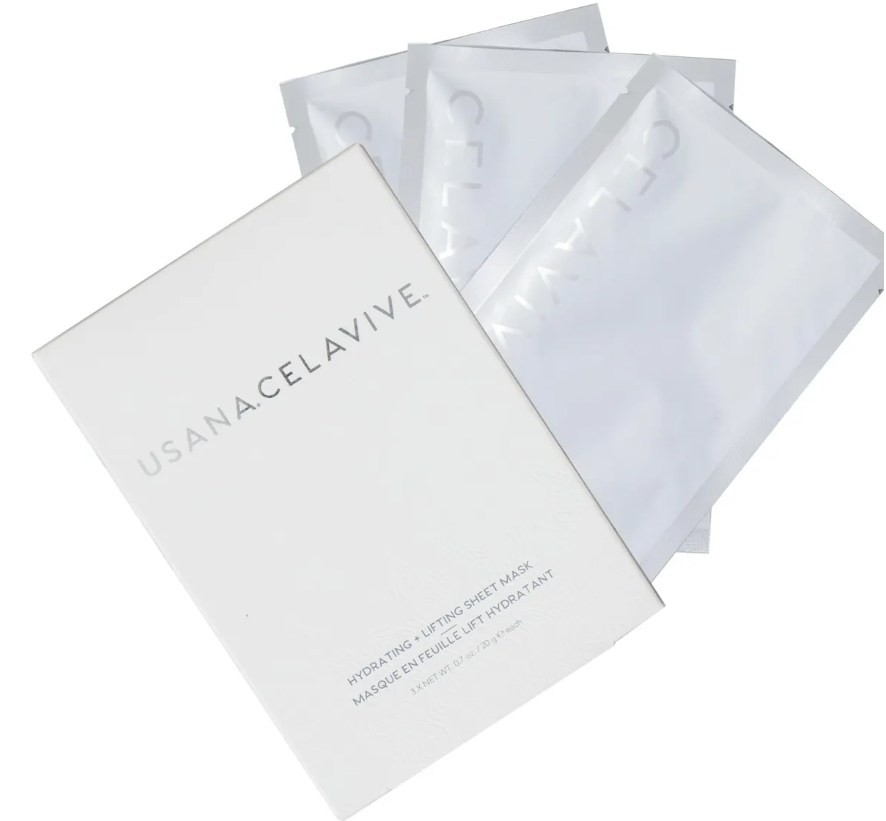 Mascarilla facial en tela de la línea Celavive desarrollada por USANA Health Sciences para hidratación intensiva y mejora de la apariencia de la piel.