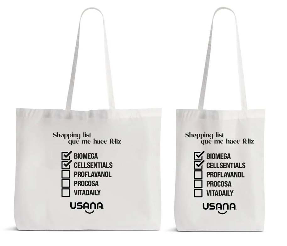 Bolsa reutilizable USANA ideal para transportar productos y usar en compras diarias con comodidad y estilo.